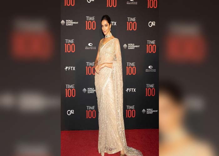 TIME 100 Impact Awards में दीपिका ने पर्ल-व्हाइट शीयर साड़ी पहनी। उनके ब्लाउज़ पर फूलों की कढ़ाई, सीक्विन और बारीक बॉर्डर थे। फेदर पल्लू, हल्के गहने और स्लीक बन ने उनकी शाश्वत भारतीय खूबसूरती को उभारा।