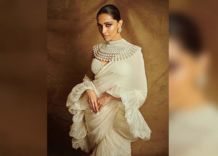 Cannes Film Festival 2022 में दीपिका ने सफेद रफल्ड साड़ी पहनी, जिसे मोतियों से सजे ब्लाउज़ और नेकलेस के साथ जोड़ा। काजल लगी आंखें, हल्का मेकअप और स्लीक बन ने उनके लुक को क्लासिक और एलिगेंट बनाया।