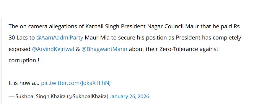 सुखपाल खैरा ने दावा किया कि नगर काउंसिल मौड़ के प्रधान करनैल सिंह ने कैमरे के सामने स्वीकार किया है कि उन्होंने अपनी प्रधानगी की कुर्सी बचाने के लिए मौड़ के ‘आप’ विधायक को 30 लाख रुपये की रिश्वत दी थी। खैरा के अनुसार इस खुलासे ने राज्य सरकार के भ्रष्टाचार विरोधी दावों की पोल खोल दी है।
