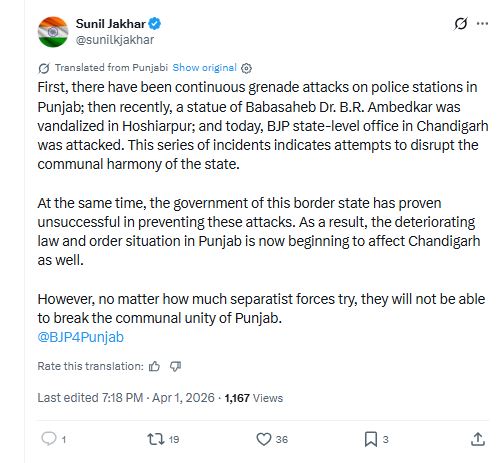 चंडीगढ़ में भाजपा कार्यालय पर ग्रेनेड अटैक के बाद पंजाब भाजपा अध्यक्ष सुनील जाखड़ का बयान सामने आया है। जाखड़ ने कहा है कि पहले पंजाब के थानों पर लगातार ग्रेनेड हमले हो रहे हैं, फिर बीते दिन होशियारपुर में बाबा साहेब डॉ. भीमराव अंबेडकर जी की मूर्ति...