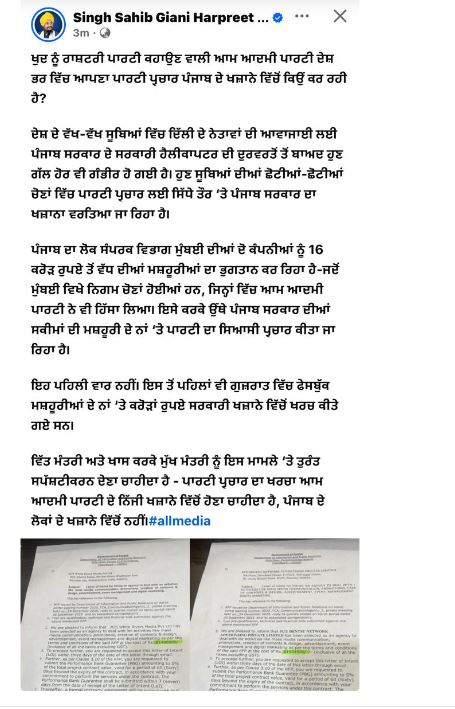 जत्थेदार ज्ञानी हरप्रीत सिंह ने राज्य की आम आदमी पार्टी को निशाने पर लिया है तथा सरकार पर पंजाब के खजाने को लूटने के गंभीर आरोप लगाए हैं। उन्होंने टवीट कर कहा कि खुद को राष्ट्रीय पार्टी कहने वाली आम आदमी पार्टी देश भर में अपना पार्टी प्रचार पंजाब के...