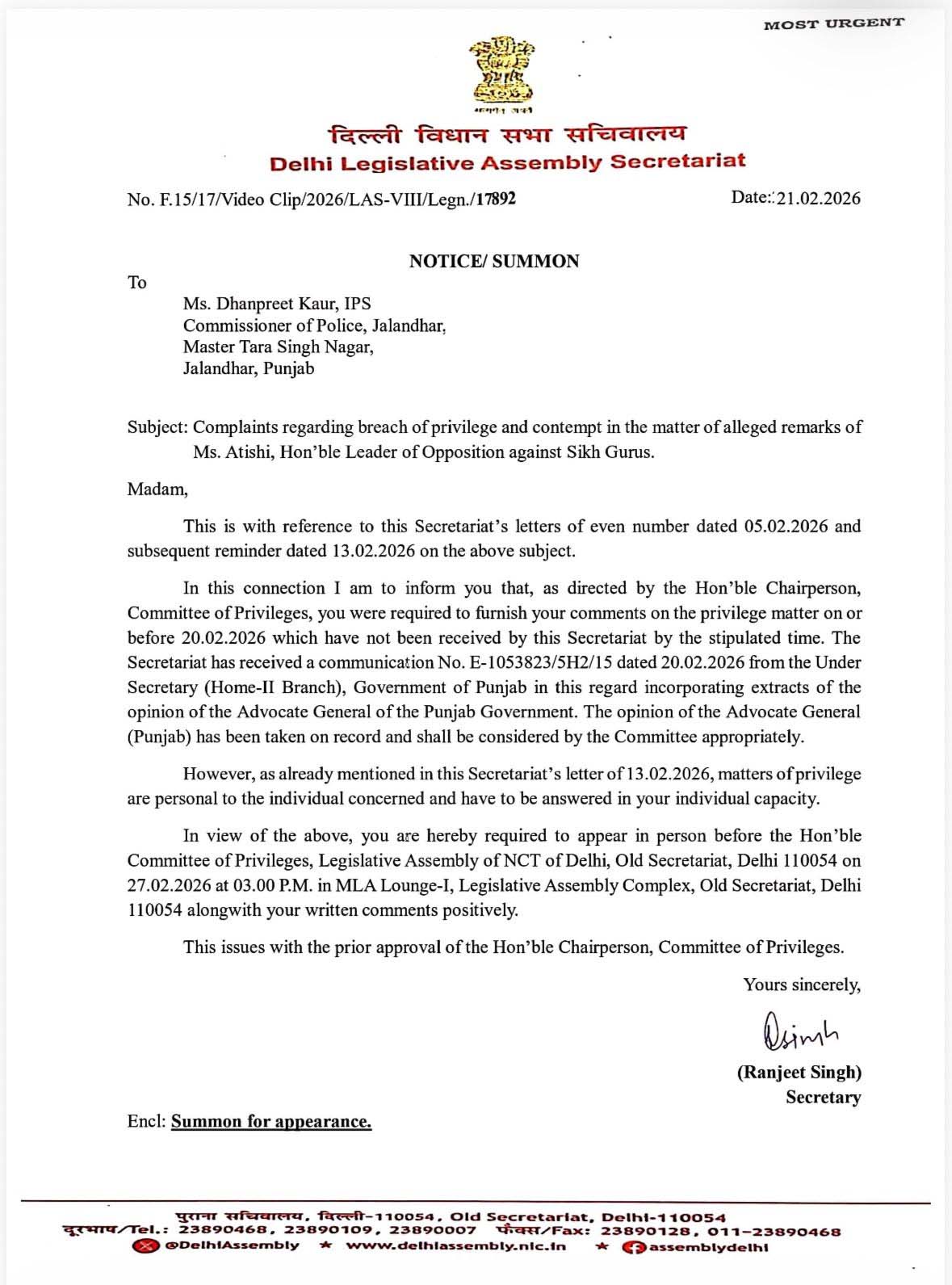 जालंधर : दिल्ली विधानसभा सचिवालय ने दिल्ली की पूर्व सीएम आतिशी की वीडियों के मामले में पंजाब के डीजीपी गौरव यादव, एडिशनल चीफ सेक्रेटरी अलोक शेखर, पुलिस कमिशनर धनप्रीत कौर को समन जारी किया है। इसी के साथ विधानसभा सचिवालय ने समन जारी करके 27 फरवरी दोपहर 3 बजे  पेश होने के आदेश दिए है। हालांकि पंजाब के अतिरिक्त मुख्य सचिव (गृह) आलोक शेखर और राज्य पुलिस प्रमुख गौरव यादव ने बताया कि आतिशी की कथित टिप्पणियों के वीडियो क्लिप के संबंध में दर्ज एफआईआर के बारे में उनके जवाबों की राज्य सरकार द्वारा जांच की जा रही है। बता दें कि इस मामले में एफआईआर जालंधर में दर्ज की गई थी।