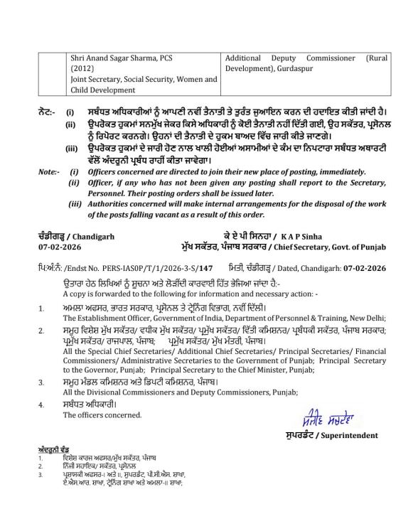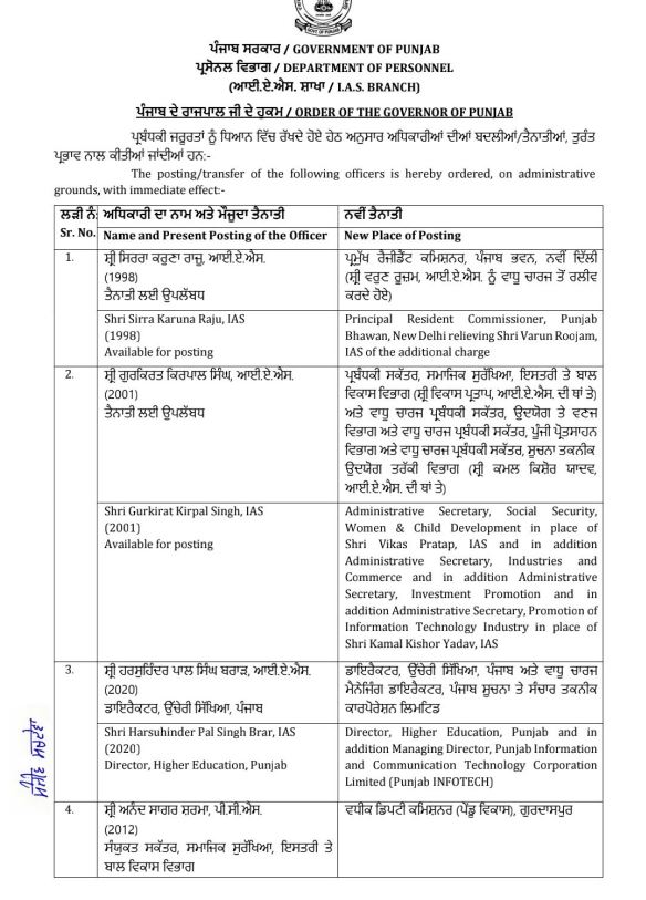 पंजाब डैस्क : पंजाब में तबादलों का दौर जारी है। इसी कड़ी के तहत आज 3 आई.ए.एस. व 1 पी.सी.एस. अधिकारी का तबादला किया गया है। अतः जिन अधिकारियों के तबादले किए गए हैं, उनके नामों की लिस्ट निम्न है।