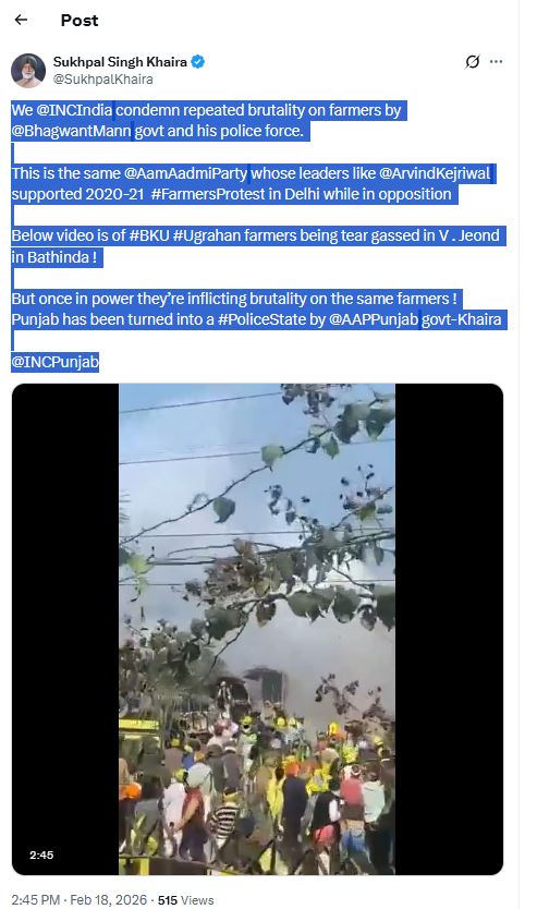 खैहरा ने कहा कि यह वही Aam Aadmi Party है जिसने दिल्ली में विपक्ष में रहते हुए 2020-21 के किसानों के आंदोलन (#FarmersProtest) का समर्थन किया था। लेकिन अब सत्ता में आने के बाद, पार्टी सत्ता में होने के नाते किसानों पर कार्रवाई कर रही है। पार्टी ने बठिंडा के वी. जिओंड में #BKU #Ugrahan किसानों पर आंसू गैस चलाने का वीडियो भी साझा किया और इसे “पंजाब को #PoliceState में बदलने वाली कार्रवाई” बताया।