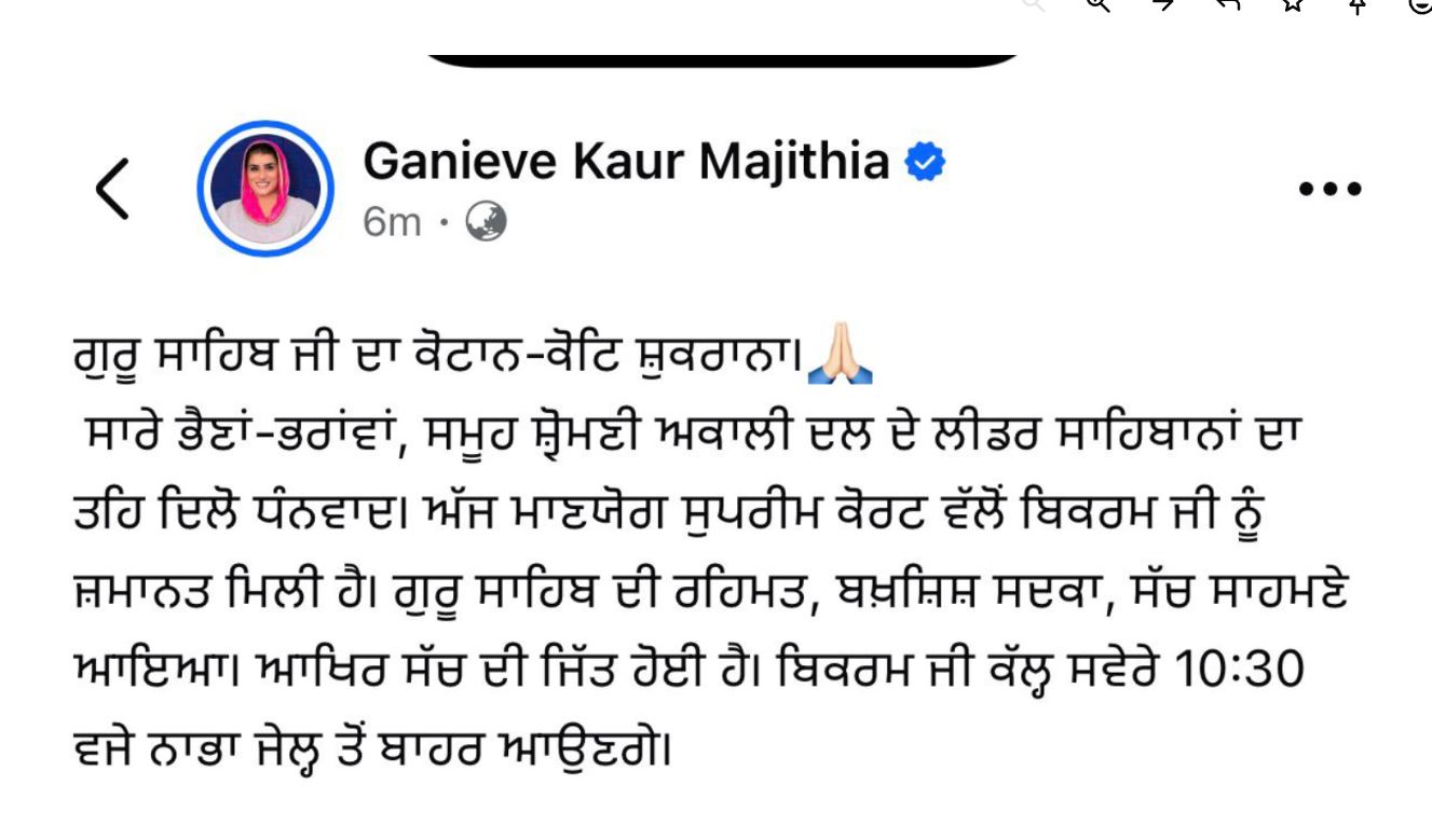 पंजाब डैस्क : अकाली नेता बिक्रम मजीठिया को सुप्रीम कोर्ट से मिली बड़ी राहत के बाद परिवार में खुशी का माहौल है। मजीठिया की पत्नी गनीव कौर ने टवीट के जरिए कहा है कि ''गुरु साहिब जी का कोटि-कोटि धन्यवाद।सभी बहनों-भाइयों और शिरोमणि अकाली दल के समस्त नेता साहिबानों का तहे दिल से धन्यवाद। आज माननीय सुप्रीम कोर्ट द्वारा बिक्रम जी को ज़मानत मिल गई है। गुरु साहिब की रहमत और बख़्शिश से सच्चाई सामने आई है। आख़िरकार सच की जीत हुई है। बिक्रम जी कल सुबह 10:30 बजे नाभा जेल से बाहर आएंगे।''